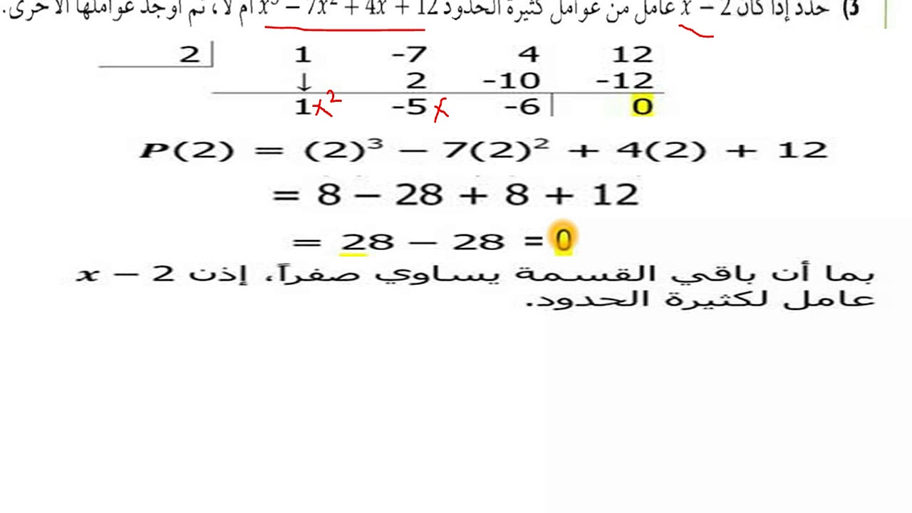الرياضيات الصف الحادي عشر تحليل كثيرات الحدود نظرية الباقي والعامل المثال 2 Youtube